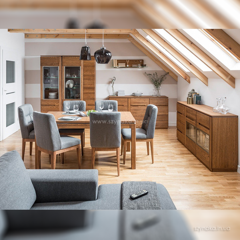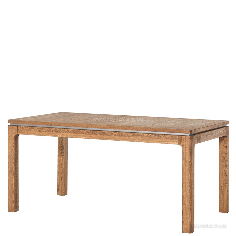 MONTENEGRO 40 SZYNAKA Стол обеденный раскладной модульной системы Монтенегро ШИНАКА с прямоугольной столешницей. Декорирован горизонтальной металлической вставкой. Для раскладывания стола используются две дополнительные вкладки шириной 45 см каждая, в сложенном состоянии стола спрятанные под столешницей.