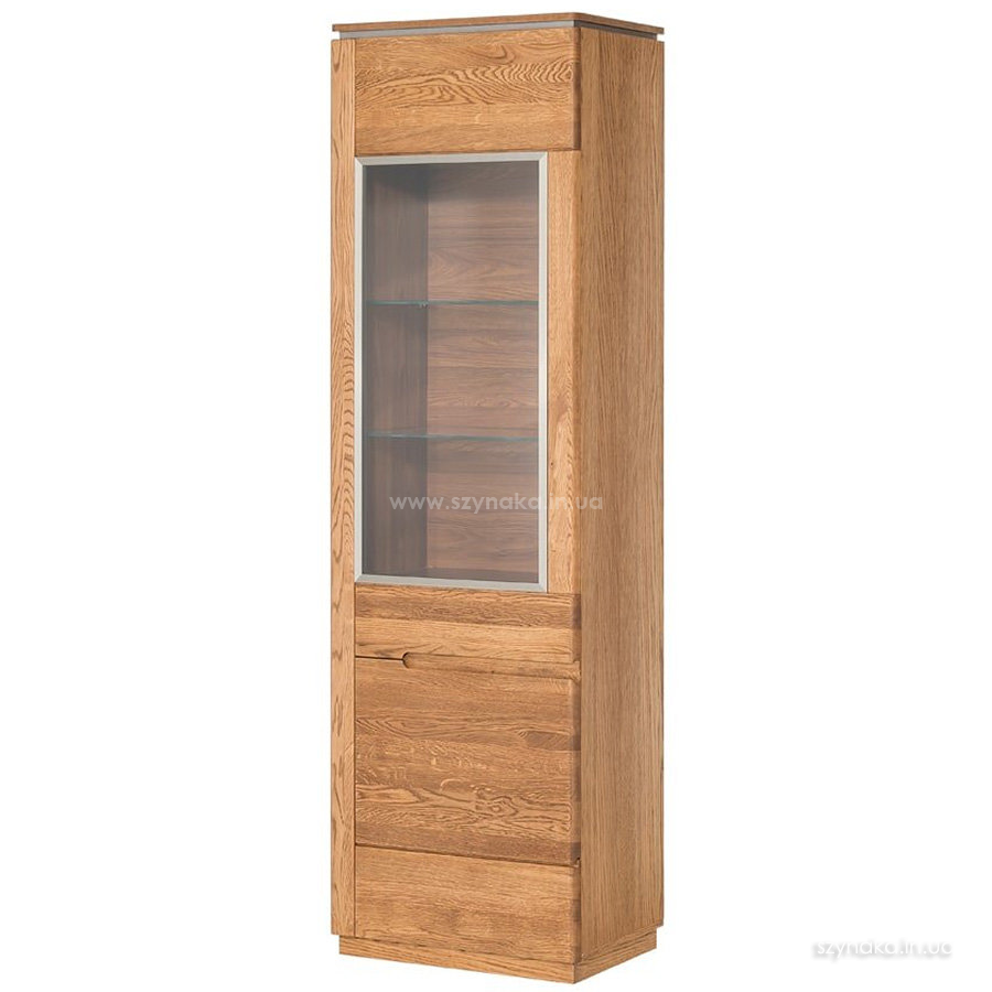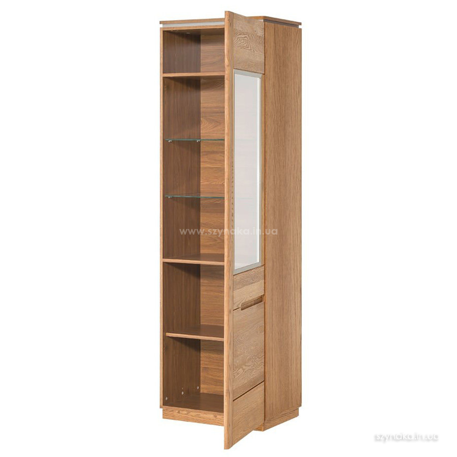 MONTENEGRO 11 SZYNAKA Витрина правая однодверная модульной системы Монтенегро ШИНАКА. Декорирована горизонтальной металлической вставкой. Двери, оснащенные прозрачным закаленным стеклом в стальной раме, открываются влево. Внутри расположено пять полок, в том числе две стеклянные. Дополнительно витрина комплектуется подсветкой 2-L-BC-1-0000-01  или 3-L-BN-2-0000-01  на выбор. Применяется система тихого закрытия двери.